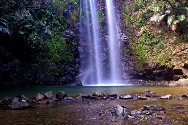 名護市の人気“リバートレッキング”スポット。川を少し歩くと到着する滝で、夏は水遊びにも最高。 。