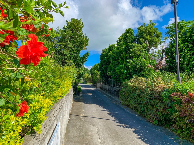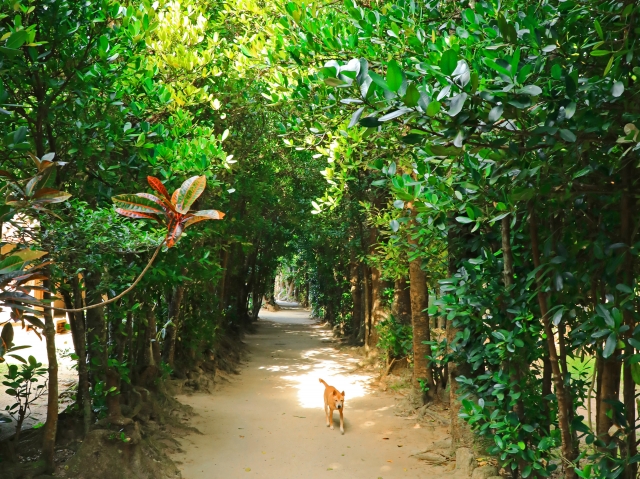 フクギの緑のトンネル を自転車や徒歩で散策でき、影が涼しく南国の雰囲気がたっぷり。